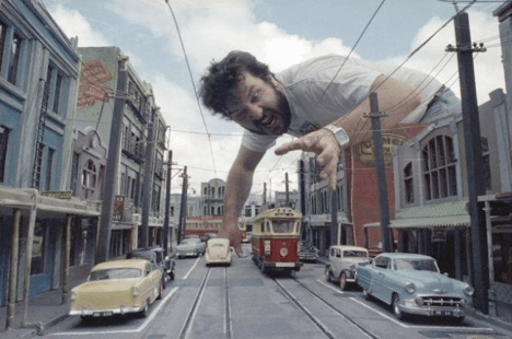 That looming, bearded figure there looking like he’s about to grab up that streetcar, rip the top off and feast on whomever’s inside is Peter Jackson, who you might know now as the director of a slightly classier film trilogy, one that won a boatload of awards and made all the money. (Stay tuned, it’s coming up.) Before he grabbed Lord of the Rings, Peter Jackson was best known for having made a handful of ultra-bloody, ultra-quirky B-movies in his native New Zealand – Braindead (Dead Alive in the U.S.), Bad Taste and Meet the Feebles, which, to be fair, isn’t so much bloody as pitch black – on a barely shoestring budget, so whatever’s happening in the shot above shouldn’t really be all that surprising. It’s fair to say, though, that if you have any stomach for splattercore and haven’t seen his early stuff, you should fix that as soon as you can.