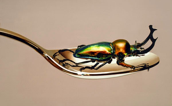 Hyperrealistic paintings of frogs, fish, and insects in a captured environment such as glass bottles, metal spoons, and silk fabric. The paintings explore living organisms and objects coexisting together in situations which may not be ideal.
