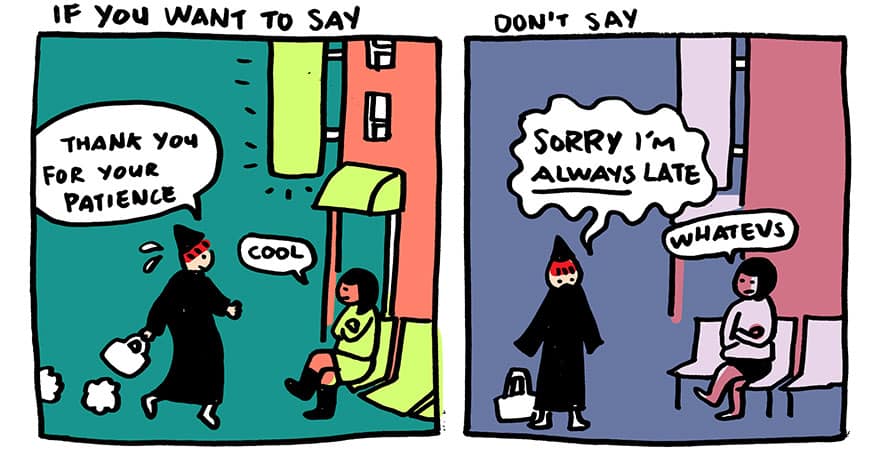 New York based artist,Yao Xiao illustrates you’re not doing anyone favors by saying “sorry”, and she suggests that you say “thank you” instead. The Internet is full of empty promises and terrible art, but this idea is worth paying attention to; see how using “Thank you” instead of “sorry” plays out below.