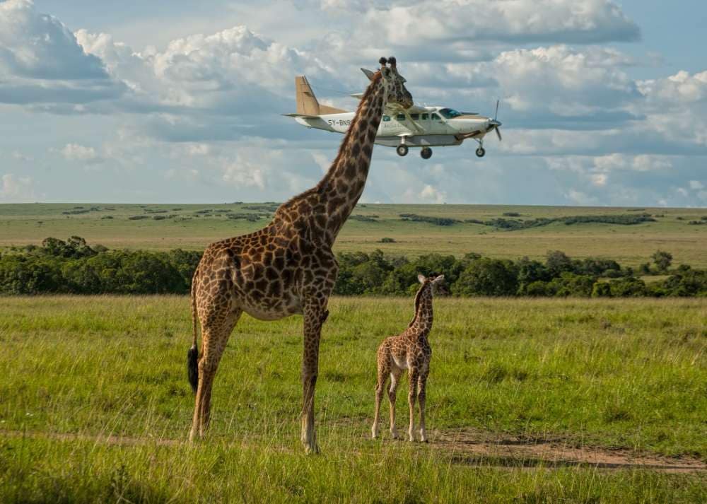 MASAI MARA, KENYA – NOVEMBER 17: A giraffe checks plane safety in Graeme Guy’s “Outsourcing Seatbelt Checks”on November 17, 2008 in Masai Mara, Kenya.