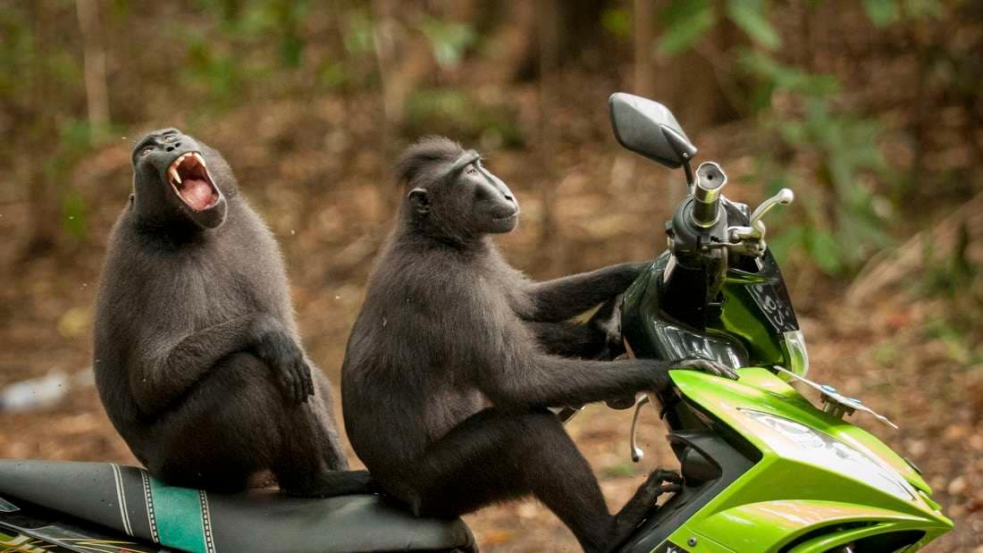 TANGKOKO BATUANGUS NATURE RESERVE, INDONESIA – UNDATED: These two monkeys broke away from their group to ‘test drive’ a motorbike parked near the entrance to the reserve in Tangkoko Batuangus Nature Reserve, Indonesia.